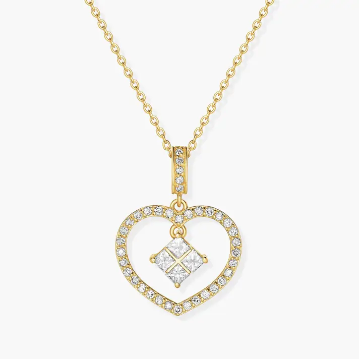 תליון אדור עשוי 14K זהב צהוב בצורת לב ומשובץ 41 יהלומים טבעיים ונוצצים. מידות התליון 1.4 ס"מ, ריבוע בתוך הלב 4 מ"מ.