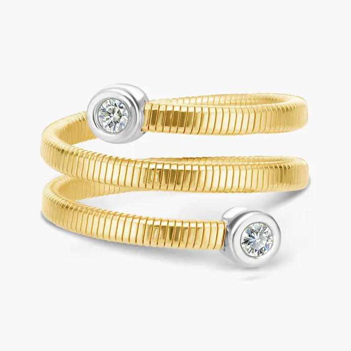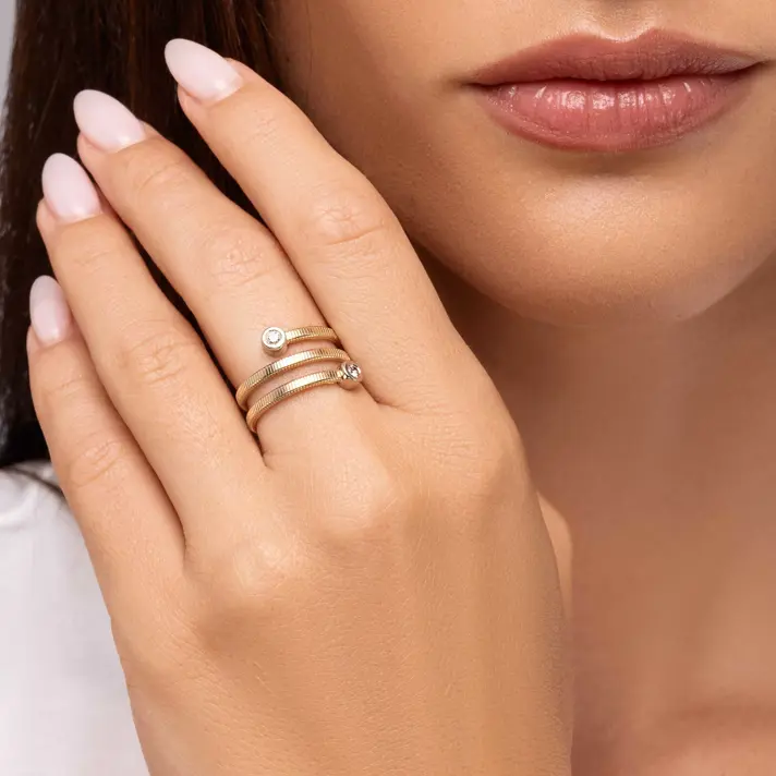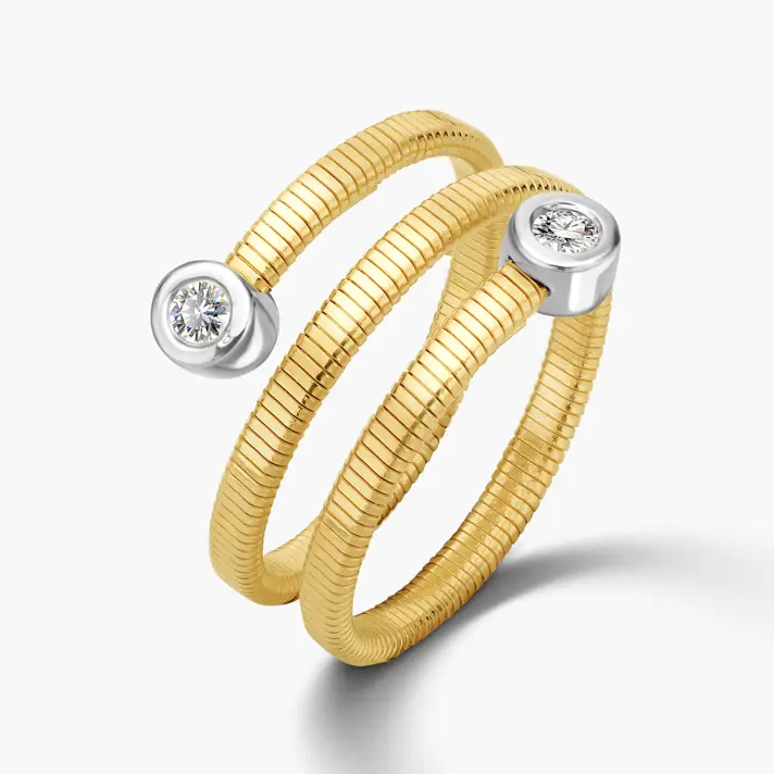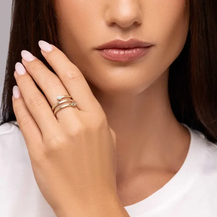 טבעת יהלום ספינאלי עשויה זהב 14K צהוב המסתלסלת על האצבע כשבשתי הקצוות שלה משובץ יהלום. עובי הטבעת כ 10 מ"מ.