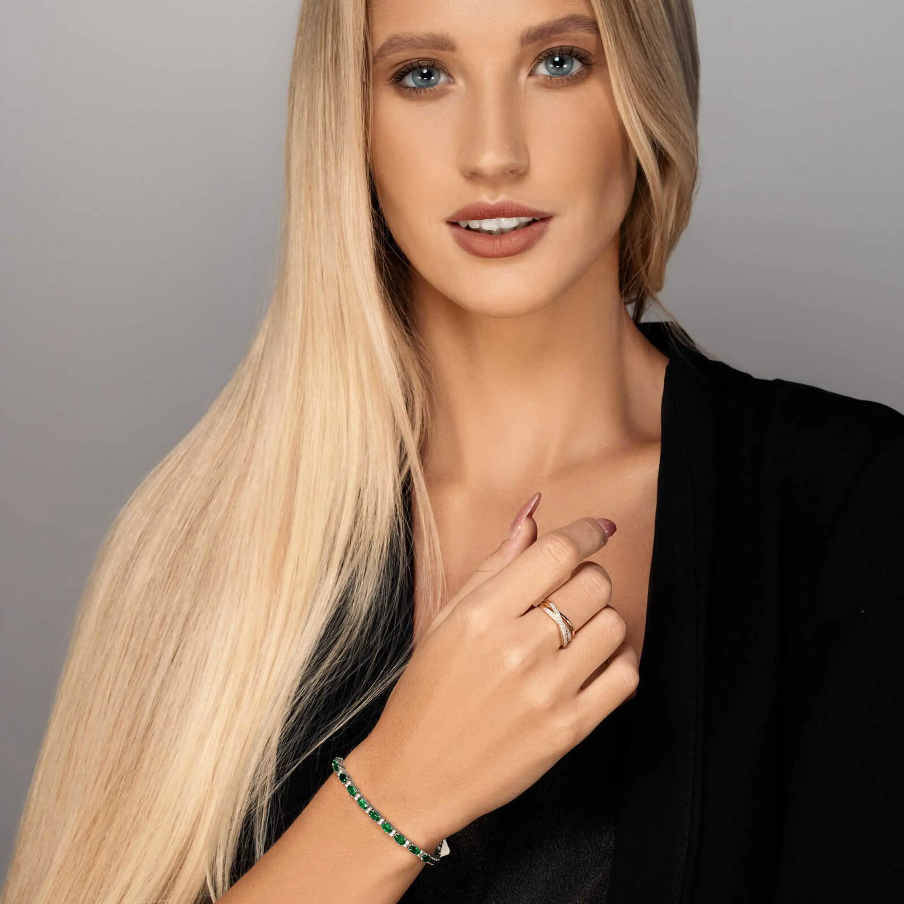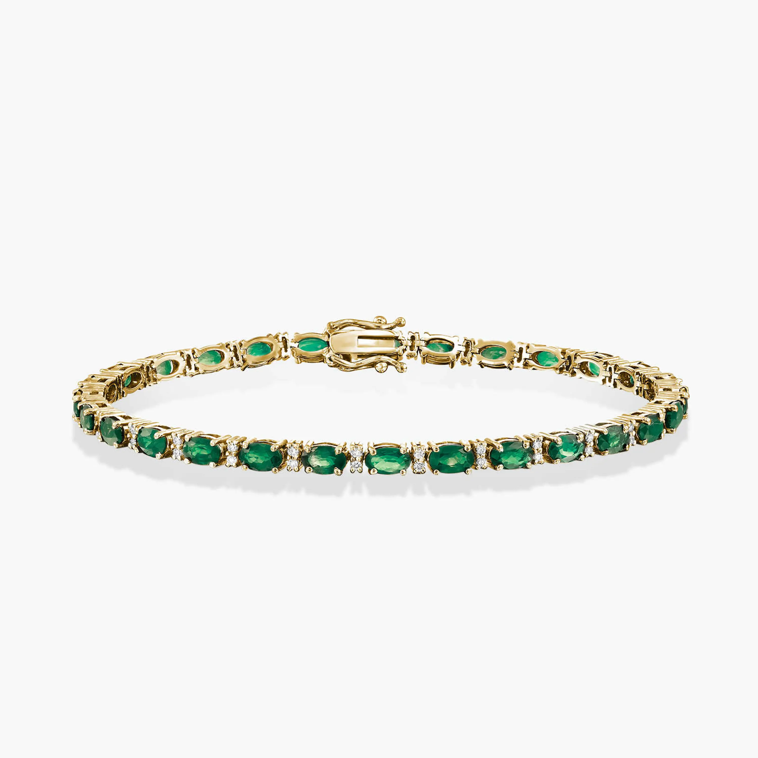 צמיד זהב 14K מהפנט המשובץ ב 28 אבני אמרלד ירוקות ובינהן 56 יהלומים טבעיים ונוצצים.