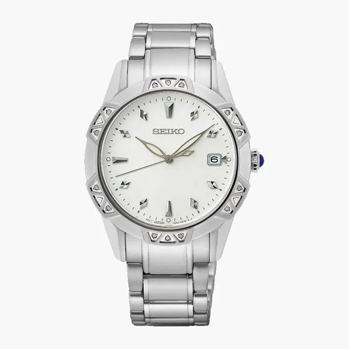 שעון סייקו לנשים משובץ יהלומים. לשעון מנגנון קוורץ 7N32 לוח השעון בגוון לבן קלאסי וחגיגי וספרות השעון בגוון כסף. לשעון צמיד פלדת אל חלד איכותי בגוון כסף. זכוכית ספיר קריסטל למניעת שריטות ועמידות למים לעומק 100 מטר. קוטר השעון 33.2 מ"מ.