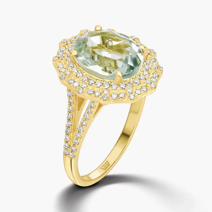 טבעת טימור עשויה זהב 14K צהוב ומשובצת באבן גרין אמטיסט מרהיבה ו 114 יהלומים טבעיים ונוצצים.