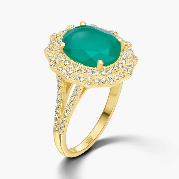 טבעת קאי עשויה זהב 14K צהוב ומשובצת באבן אגת בגוון ירוק עמוק ו 114 יהלומים טבעיים ונוצצים.