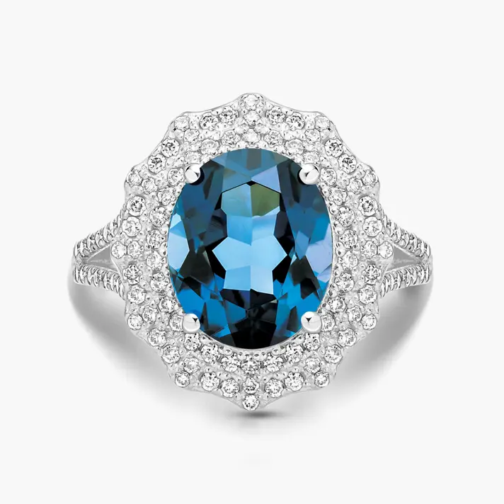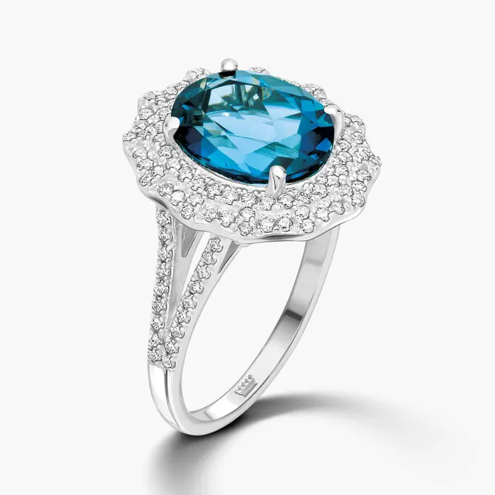 טבעת גאיה עשויה זהב 14K לבן ומשובצת באבן בלו לונדון כחולה ו 114 יהלומים טבעיים ונוצצים.