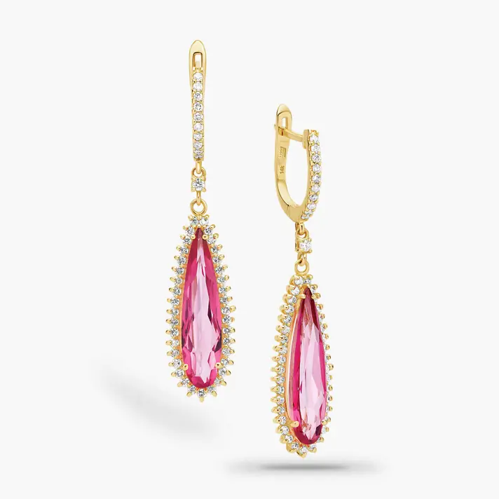 עגילי יהלום פינק, עשויים זהב 14K צהוב ומשובצים באבן טופז ורודה מרכזית ו 96 יהלומים טבעיים ונוצצים. אורך העגיל 4 ס"מ
