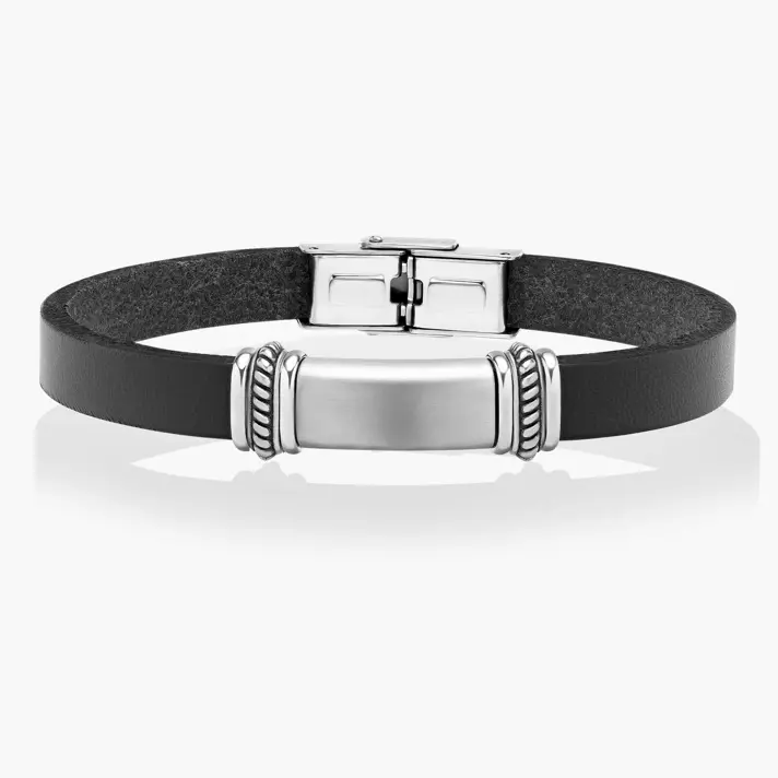 צמיד ליאון מקולקציית צמידי הגברים Status- עשוי עור שחור איכותי ובשילוב פלטת פלדה במרכז הצמיד וחרוזי פלדה כסופים מצידיה. סוגר הצמיד עשוי פלדת אל חלד איכותי.