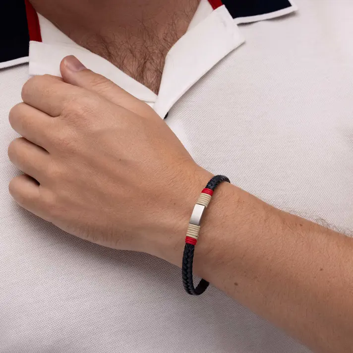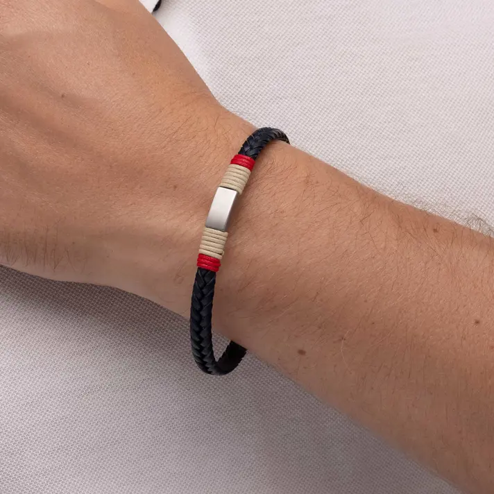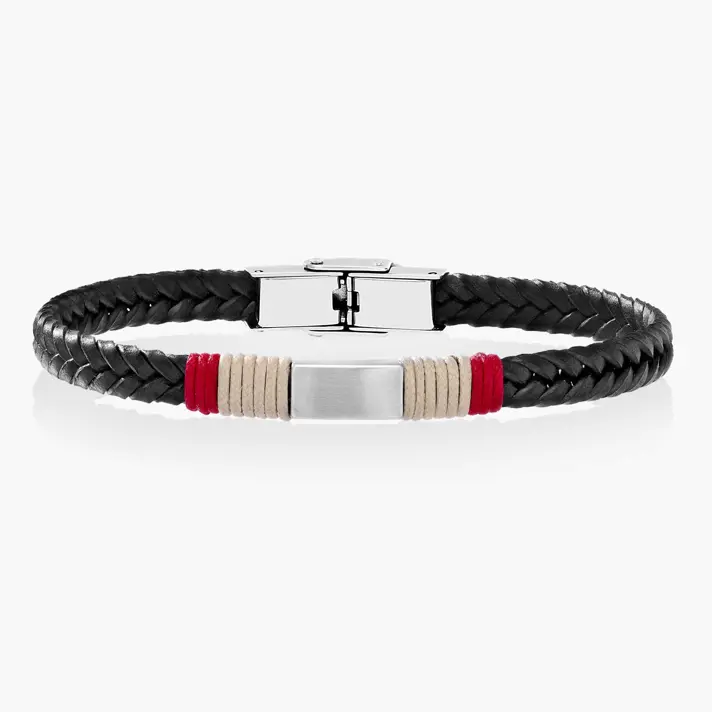 צמיד אייל מקולקציית צמידי הגברים Status- עשוי רצועת עור איכותית במראה צמה. במרכז הצמיד פלטת פלדה ורצועות עור בגווני אדום ולבן. סוגר הצמיד עשוי פלדת אל חלד.