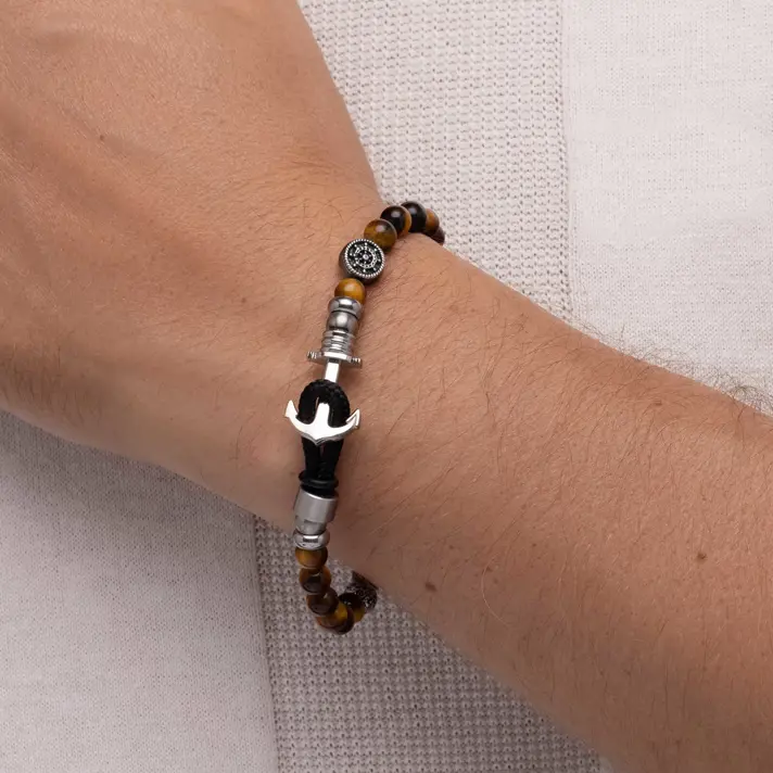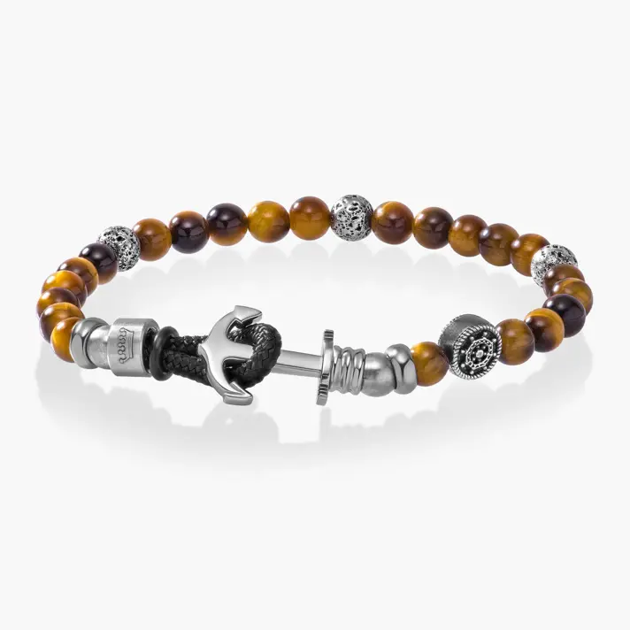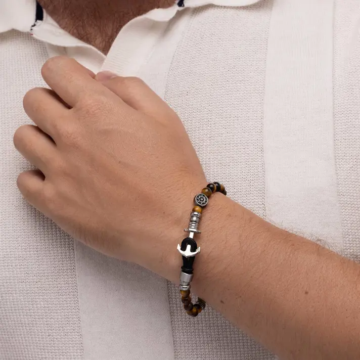 צמיד אלון מקולקציית צמידי הגברים- Status, עשוי חרוזי עין הנמר בגווני זהב צהוב וחום בשילוב חרוזי פלדה וחרוז הגה, סוגר הצמיד עשוי חרוז עוגן פלדה המתחבר לצמיד באמצעות רצועת פוליאסטר איכותי המונע ספיגת זיעה\ מים.