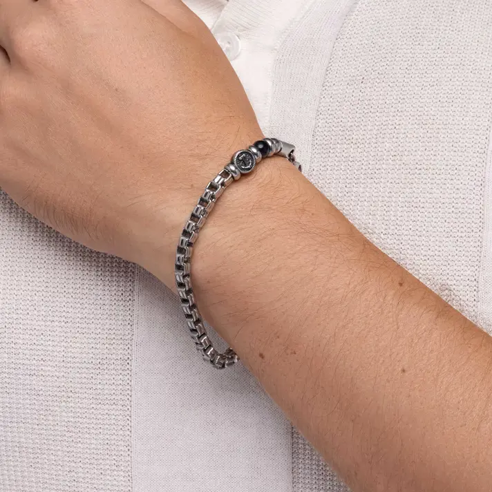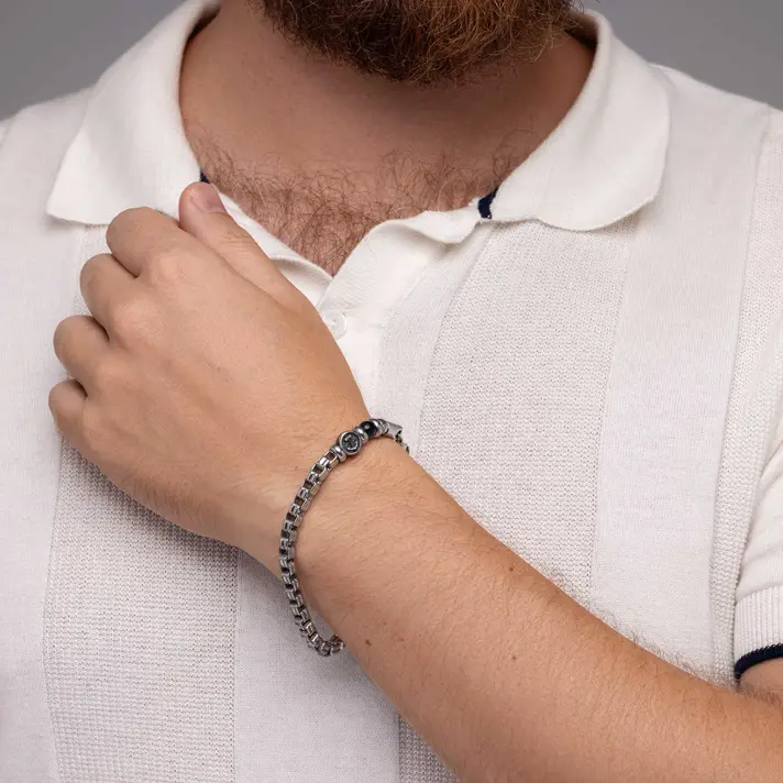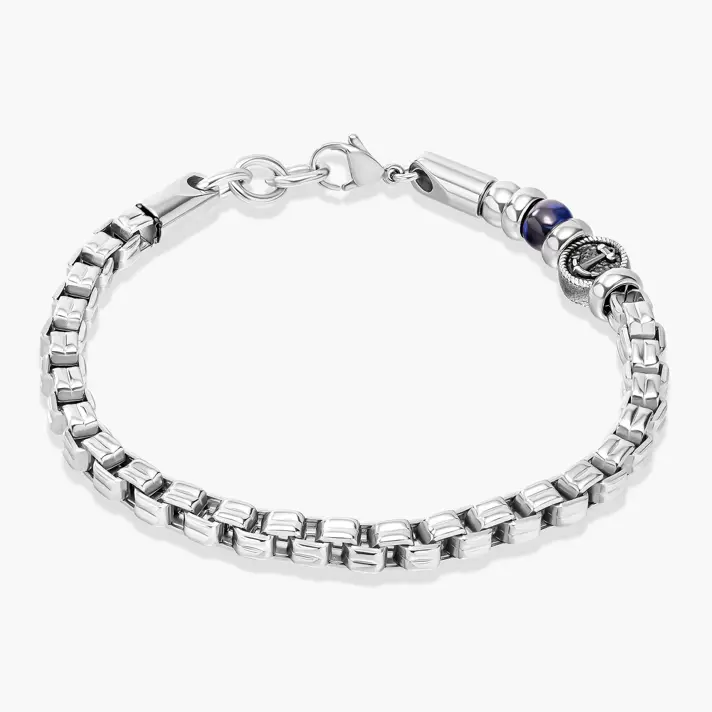 צמיד ירין מקולקציית צמידי הגברים Status- עשוי חרוזי פלדה, בשילוב חרוז עוגן וחרוז כחול . סוגר הצמיד עשוי פלדת אל חלד.