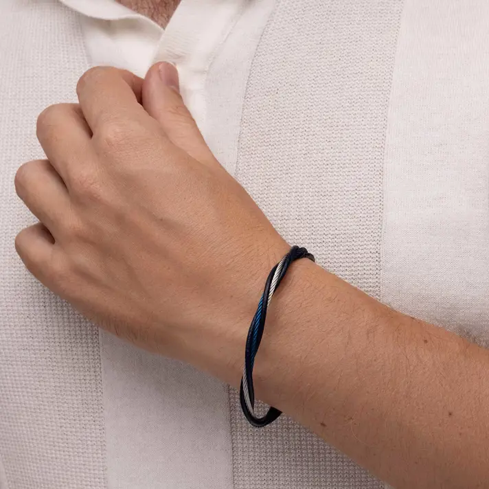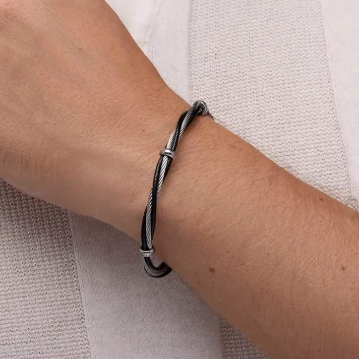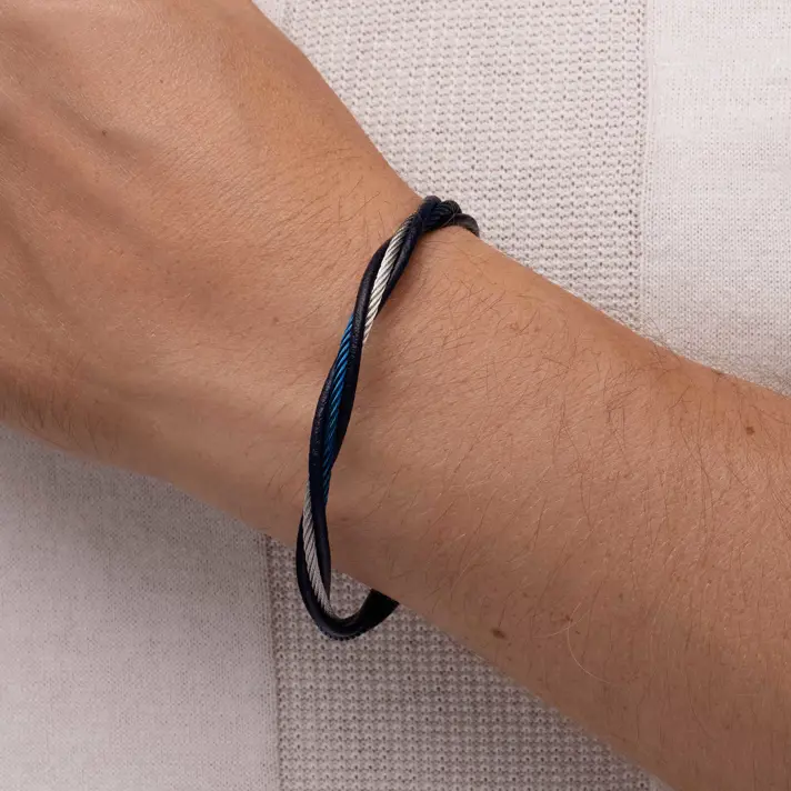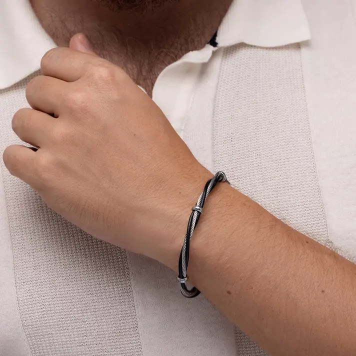 צמיד אופיר מקולקציית צמידי הגברים- Status, עשוי 3 רצועות- שתי רצועות עור איכותי ורצועת פלדה. השכבות מחוברות באמצעות חרוזי פלדה ולצמיד סוגר פלדת אל חלד.
