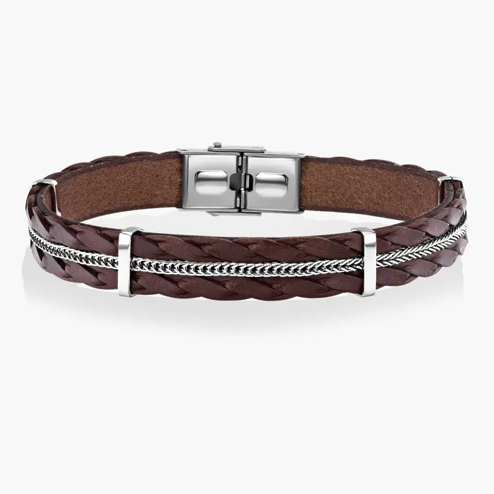 צמיד הראל מקולקציית צמידי הגברים Status- עשוי עור חום איכותי במראה צמות ובשילוב צמת פלדה וחרוזי פלדה כסופים. סוגר הצמיד עשוי פלדת אל חלד.