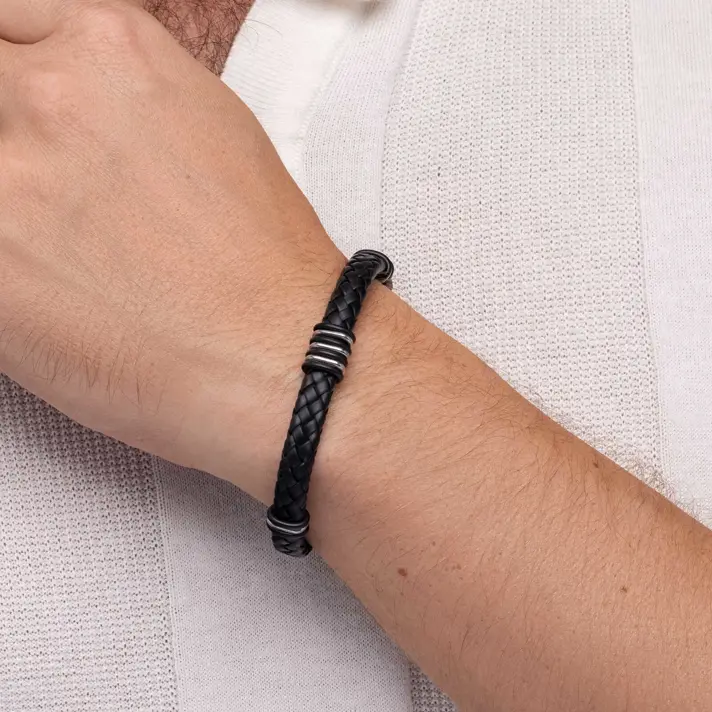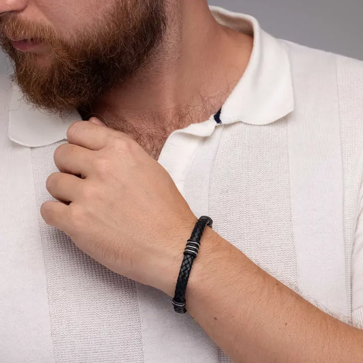 צמיד אליאב מקולקציית צמידי הגברים Status- עשוי רצועת עור סינטטית במראה צמה בשילוב חרוזי פלדה כסופים ומושחרים לאורך הצמיד. סוגר הצמיד עשוי פלדת אל חלד.