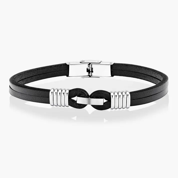 צמיד דן מקולקציית צמידי הגברים Status- עשוי 2 רצועות מעור שחור איכותי היוצרות לולאה המתחברת לחרוז פלדה במרכז הצמיד ובשילוב חרוזי פלדה. סוגר הצמיד עשוי פלדת אל חלד.