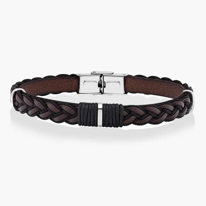 צמיד נועם מקולקציית צמידי הגברים Status - עשוי עור איכותי בגווני חום ושחור במראה צמות המשתלבות זו בזו ובשילוב חרוזי פלדה כסופים ורצועות עור שחורות אנכיות. סוגר הצמיד עשוי פלדת אל חלד.