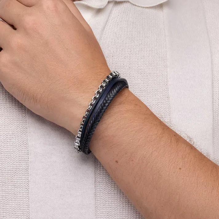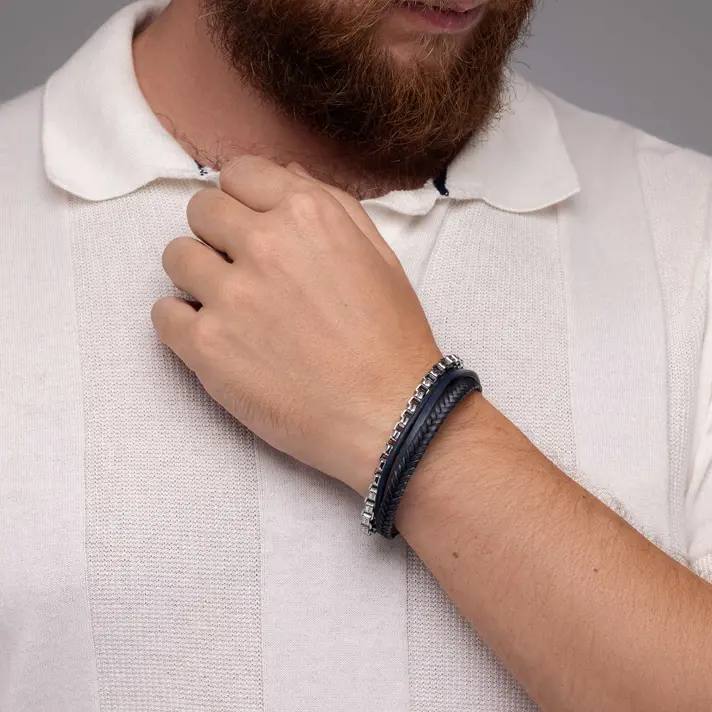 צמיד אלעד מקולקציית צמידי הגברים- Status, עשוי 4 רצועות המתחברות לצמיד אחד. שלוש רצועות עור איכותי בטקסטורות שונות, ורצועה נוספת במראה צמת פלדה. הרצועות מתחברות לסוגר פלדת אל חלד.