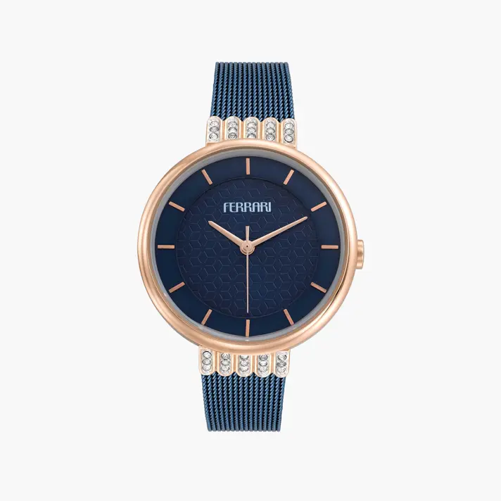 שעון FERRARI אופנתי לנשים עם לוח כחול ועליו דוגמת פרחים עדינה עם מחוגים וסימוני ספרות בגוון זהב אדום. לשעון צמיד מש אופנתי כחול המעוטר בחיבור לשעון עם אבני חן נוצצות.