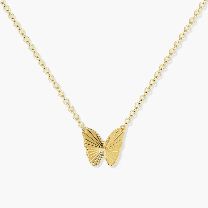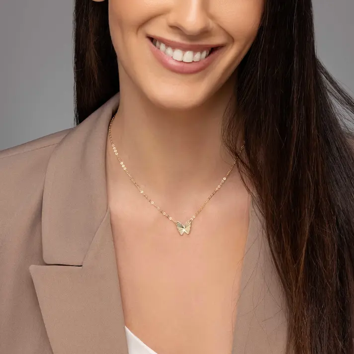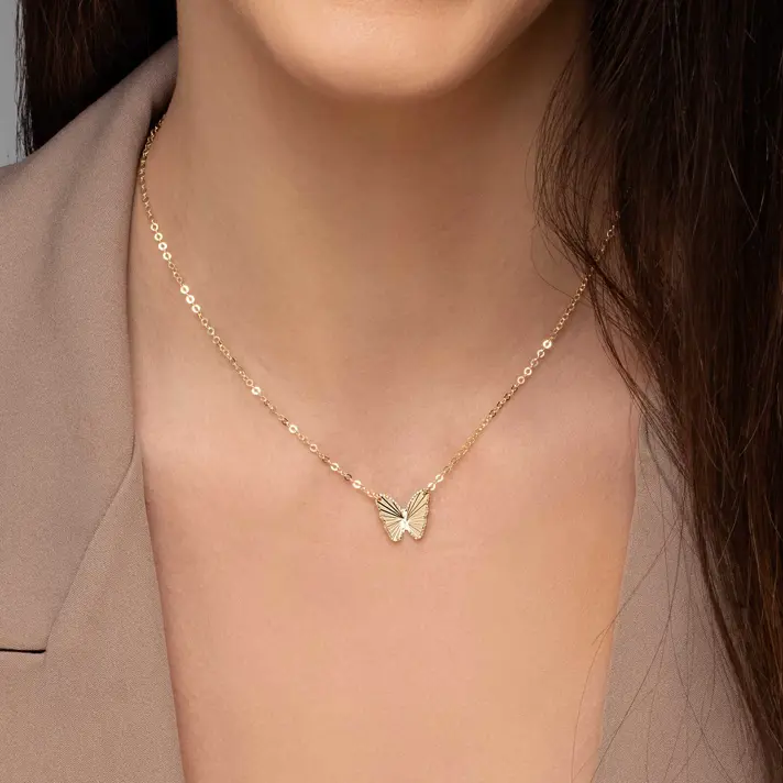 שרשרת ג'ויה- עשויה זהב צהוב 14K עם תליון פרפר בחיתוכי לייזר לנצנוץ מקסימלי. אורך השרשרת 41 ס"מ + 5 ס"מ הארכה נוספים.