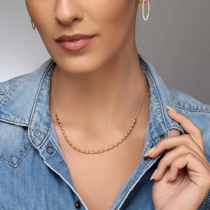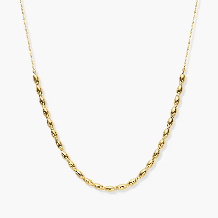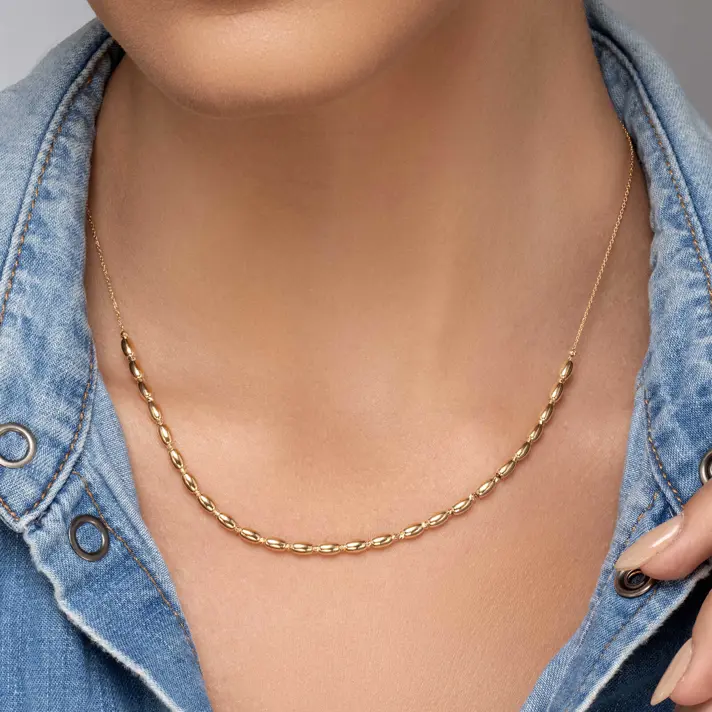 שרשרת זהב 14K ובמרכזה חוליות זהב בצורת אורז בגימור זהב מבריק עם כדורי זהב בגימור לייזר מנצנץ בין חוליה לחוליה. אורך השרשרת 45 ס"מ.