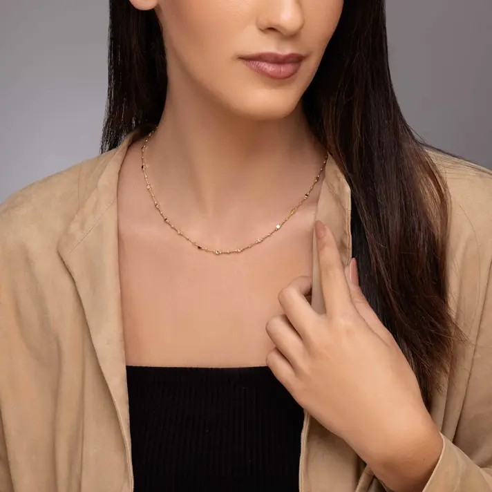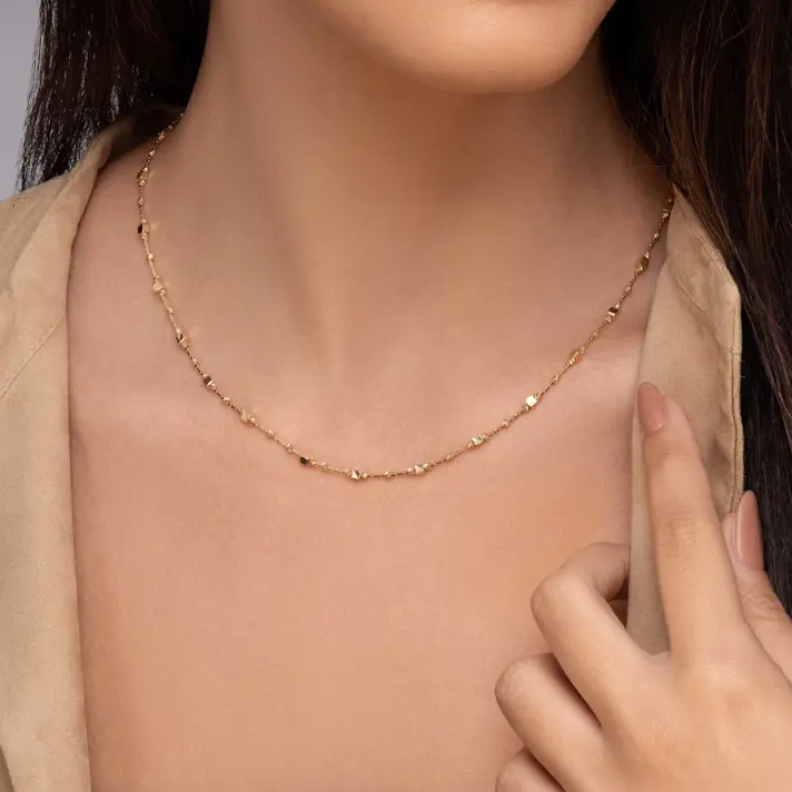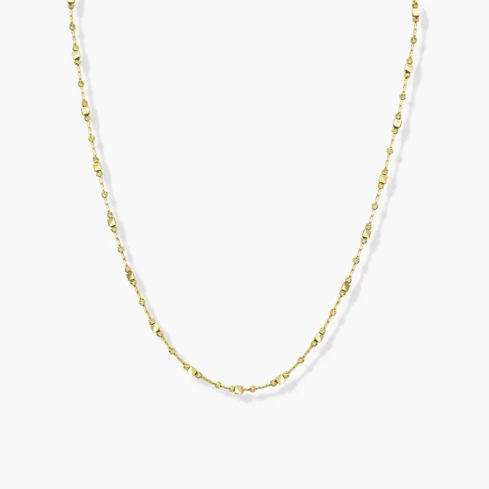 שרשרת זהב 14K מנצנצת המשלבת כדוריות זהב בחיתוך השובר את קרני האור ויוצר נצנוץ ובקוביות זהב בגימור מבריק. אורך השרשרת 43 ס"מ בתוספת 4 ס"מ הניתנים להארכה.