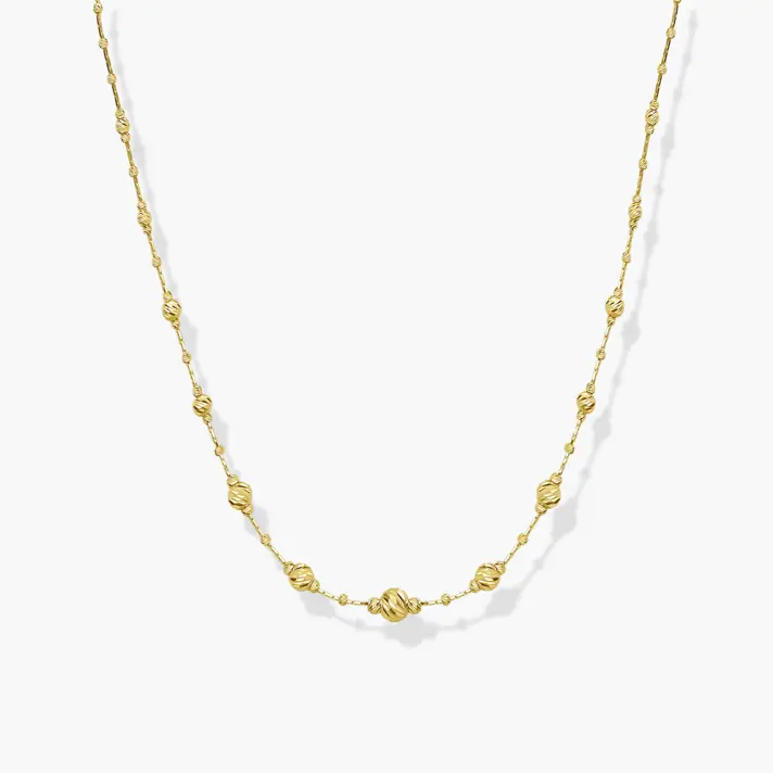 שרשרת זהב 14K בעיבוד לייזר מנצנץ ועליה כדוריות זהב בקטרים שונים של 6-20 מ"מ. אורך השרשרת 42 ס"מ ועוד 4 ס"מ הניתנים להארכה.