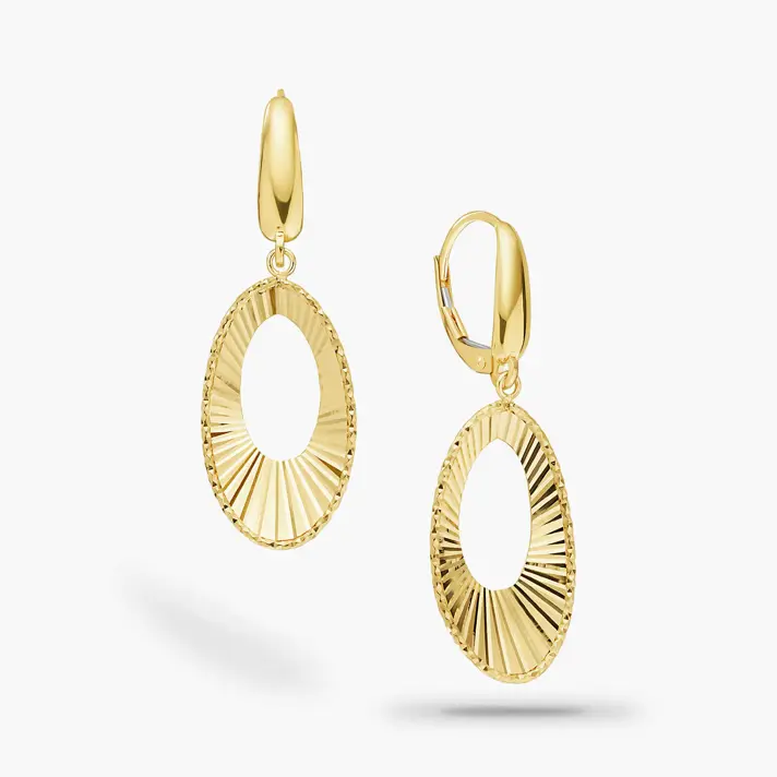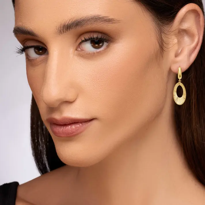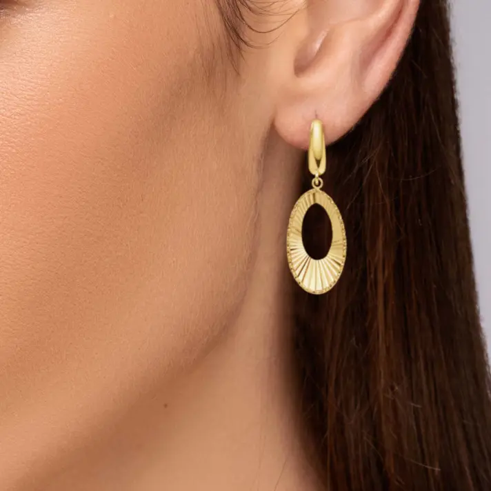 לבלוט בכל מקום, בעדינות ויופי עם עגילי זהב ניקול מקולקציית HOLLYWOOD, הקולקציה שנועדה לנשים שנולדו לבלוט, בדיוק כמו כוכבות הוליווד על השטיח האדום. העגילים עשויים זהב 14K צהוב במראה אובלי עם חיתוכי לייזר. אורך העגילים 2.5*1.5 ס"מ