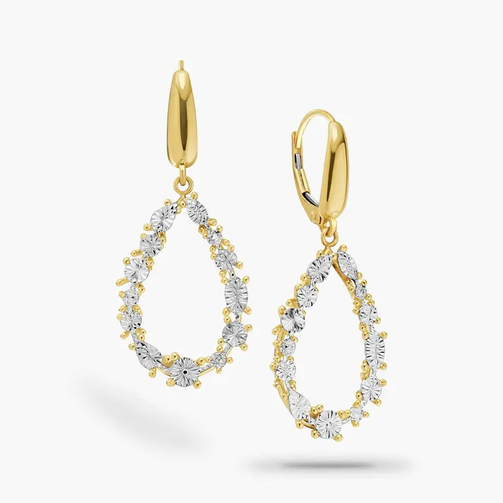 עגילי זהב 14K מרוקעים ובצורת טיפה המשלבים זהב לבן וצהוב. אורך העגילים 4 ס"מ.