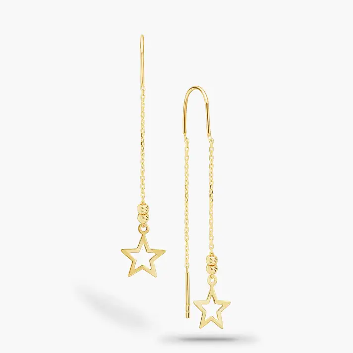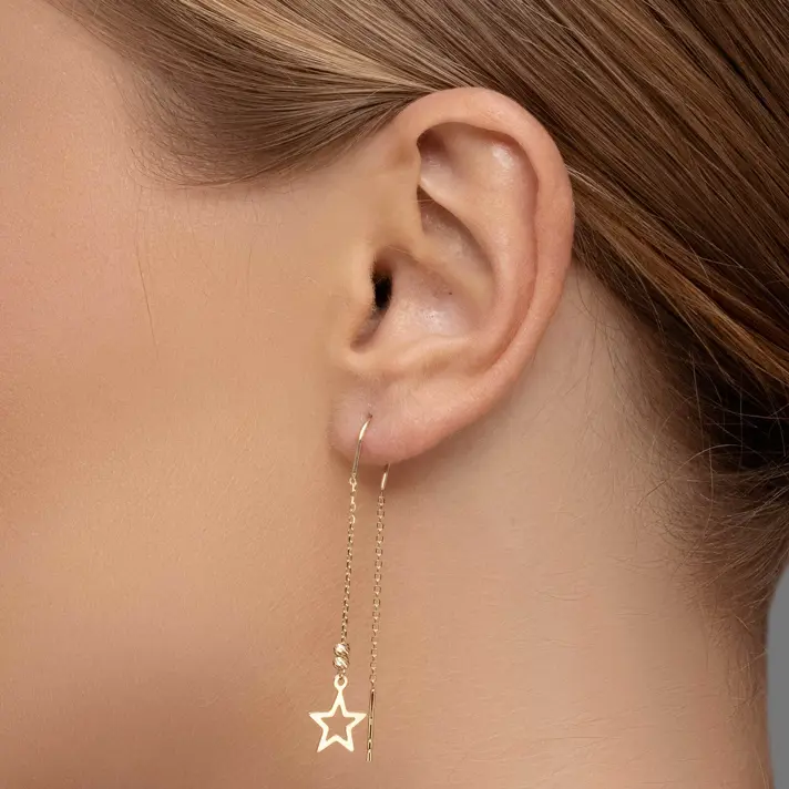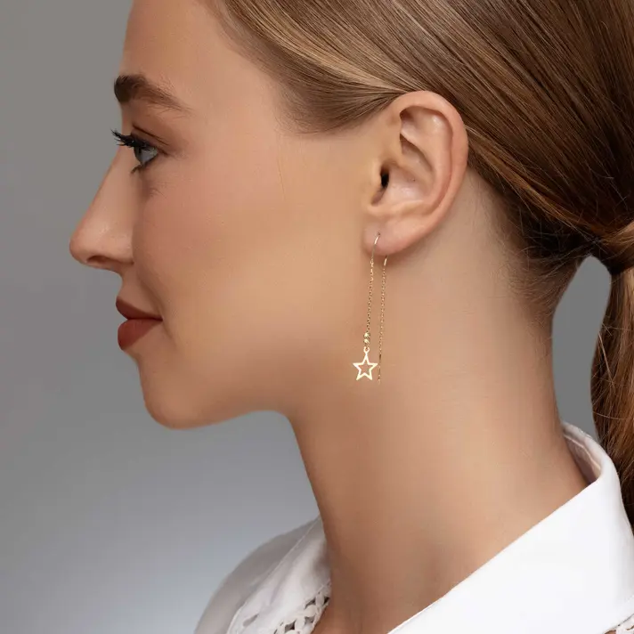 עגילי נלי תלויים- עשויים זהב 14K צהוב עם סיומת של כוכב. אורך העגיל 5 ס"מ.