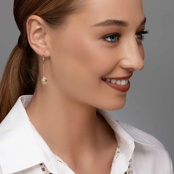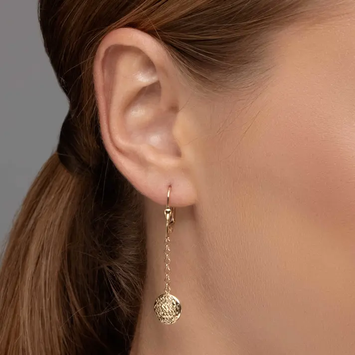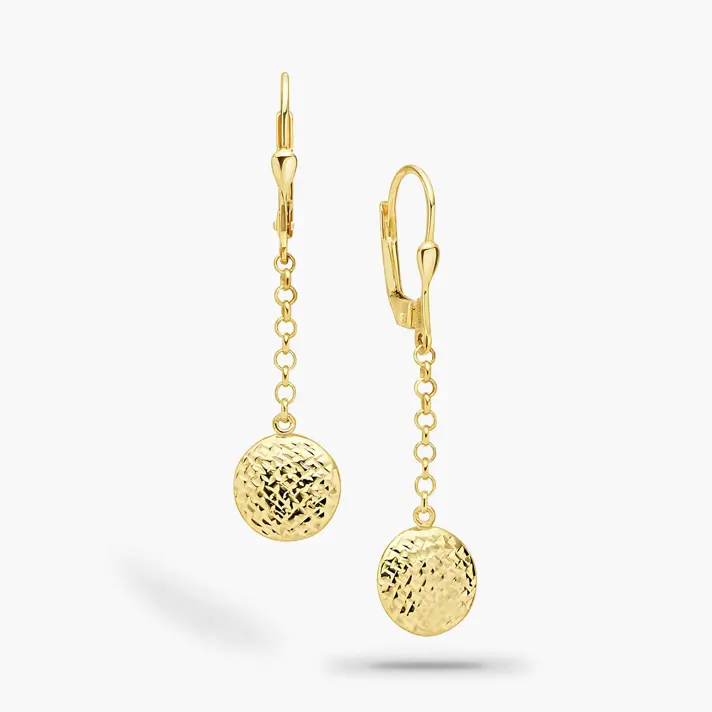 עגילי זהב מיילי- עשויים זהב 14K צהוב, תלויים עם סיומת עיגול בטקסטורה עם חיתוכיםגיאומטריים לנצנוץ מקסימלי. אורך העגילים 4.3 ס"מ