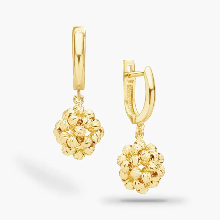 עגילי ונציה נופלים עשויים זהב 14K צהוב, מקולקציית ה- GOLDEN GLOW החדשה השומרת על קווים קלאסיים ובעיצוב עכשווי. העגילים עשויים כדורי זהב. אורך העגיל 2.3 ס"מ קוטר כדור 0.9 ס"מ.