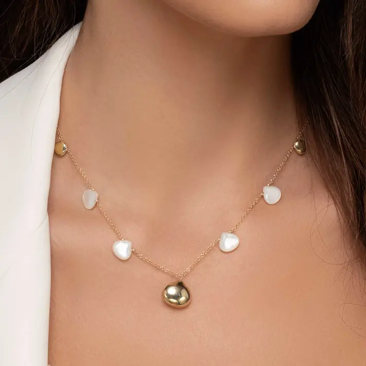 שרשרת יסמין, מקולקציית ENERGY GEM - עשויה זהב 14K צהוב, בשיבוץ אם הפנינה. אבני החן ידועות כבר במשך שנים רבות כאבנים ייחודיות עם כוח מיסטי ועם תכונות מעצימות, כאשר לפי האמונה, כל מי שמחזיק באבן זוכה באנרגיה מיוחדת השייכת לאותה האבן. פנינה היא אחת מאבני החן הייחודיות ביותר והיא מסמלת טוהר, זוהר, נשיות ועדינות. היא ידועה בסגולות רפואיות הקשורות למערכת העיכול, מסמלת תום וחכמה ומפיגה לחצים. אורך השרשרת 43 ס"מ