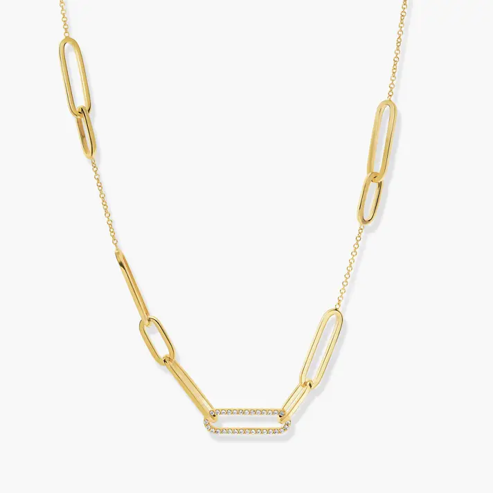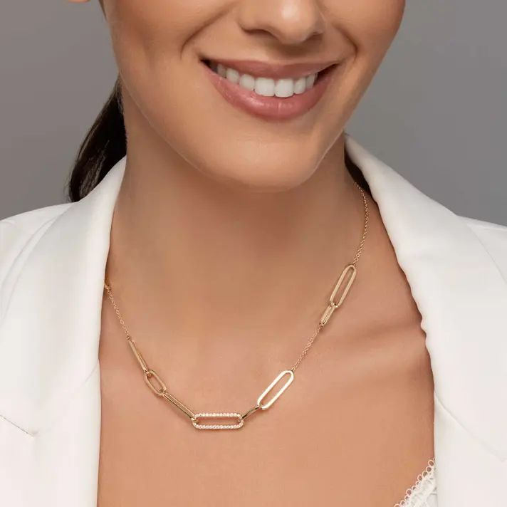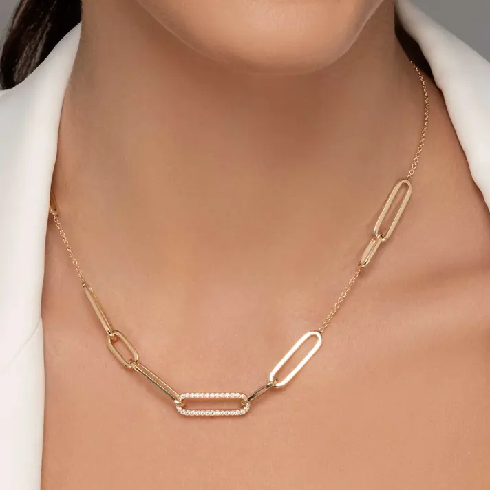 שרשרת LINK עשויה זהב 14K צהוב, בשילוב חוליות חלקן משובצות זרקונים. אורך השרשרת 43 ס"מ.