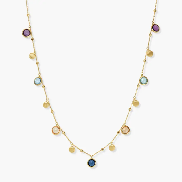 שרשרת נופר, מקולקציית ENERGY GEM - עשויה זהב 14K צהוב, בשיבוץ אבני חן טבעיות. אבני החן ידועות כבר במשך שנים רבות כאבנים ייחודיות עם כוח מיסטי ועם תכונות מעצימות, כאשר לפי האמונה, כל מי שמחזיק באבן זוכה באנרגיה מיוחדת השייכת לאותה האבן. בשרשרת זו משובצות אבני החן אמטיסט, בלו טופז, סיטרין, לונדון טופז. אורך השרשרת 43 ס"מ.