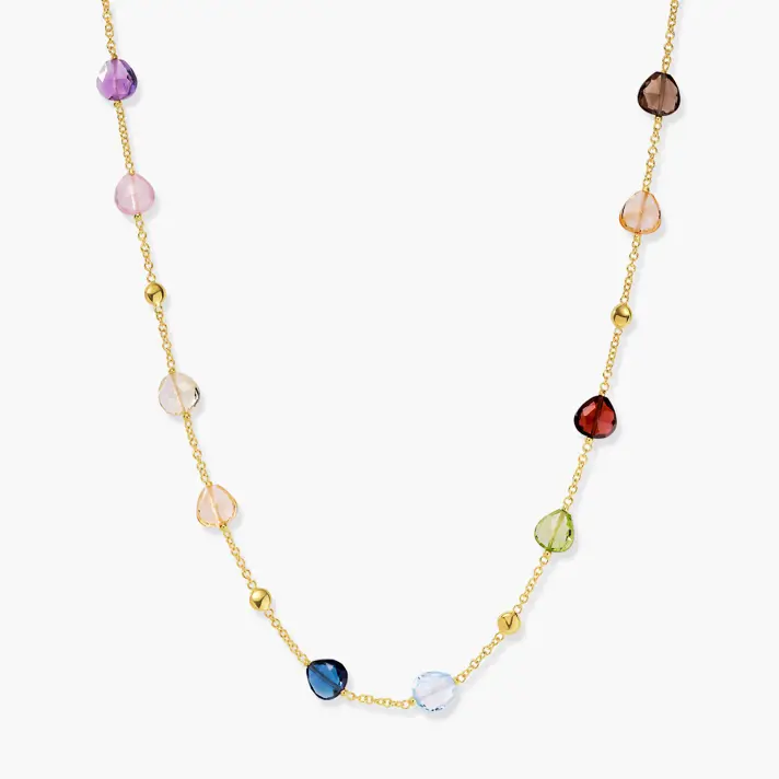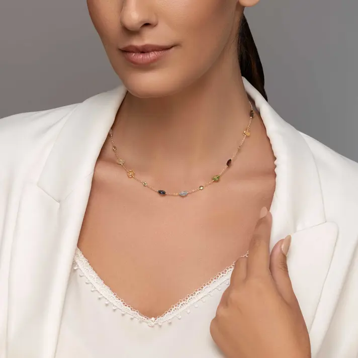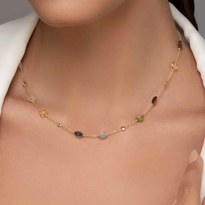 שרשרת עינב, מקולקציית ENERGY GEM - עשויה זהב 14K צהוב, בשיבוץ אבני חן טבעיות. אבני החן ידועות כבר במשך שנים רבות כאבנים ייחודיות עם כוח מיסטי ועם תכונות מעצימות, כאשר לפי האמונה, כל מי שמחזיק באבן זוכה באנרגיה מיוחדת השייכת לאותה האבן. בשרשרת זו משובצות אבני החן סמוקי למון, רוז קוורץ, סיטרין, גרנט, פרידוט. אורך השרשרת 43 ס"מ.