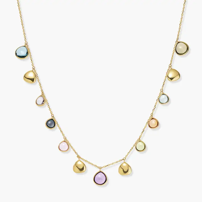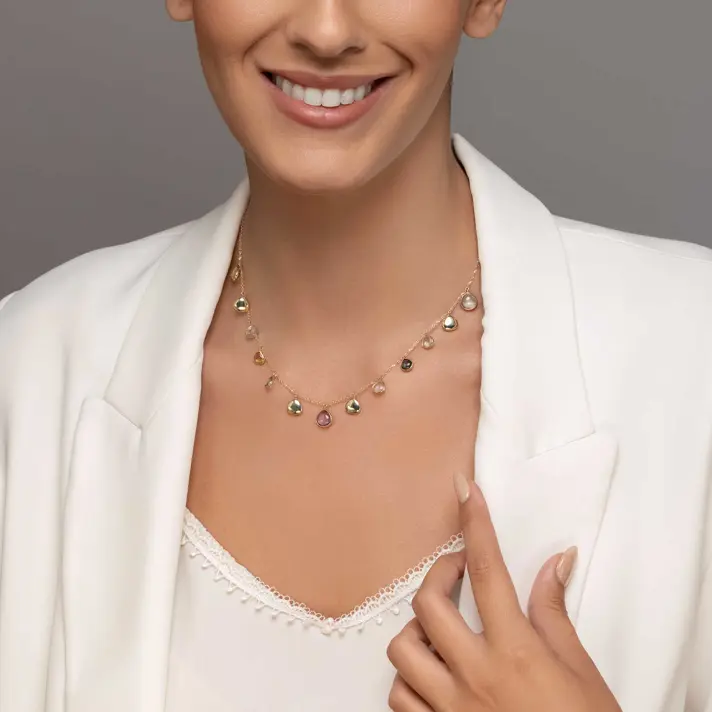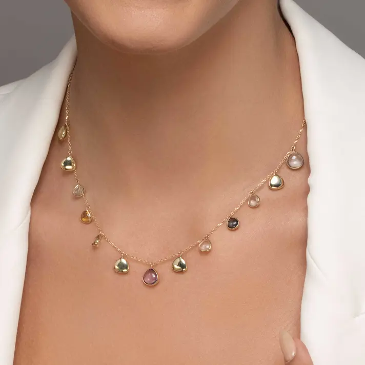 שרשרת רוז, מקולקציית ENERGY GEM - עשויה 2 שכבות זהב 14K צהוב, בשיבוץ אבני חן טבעיות. אבני החן ידועות כבר במשך שנים רבות כאבנים ייחודיות עם כוח מיסטי ועם תכונות מעצימות, כאשר לפי האמונה, כל מי שמחזיק באבן זוכה באנרגיה מיוחדת השייכת לאותה האבן. בשרשרת זו משובצות אבני החן רוז קוורץ, לונדון טופז, גרין אמטיסט, בלו טופז. אורך השרשרת 43 ס"מ.