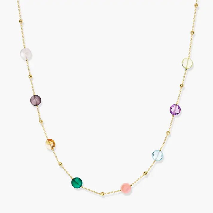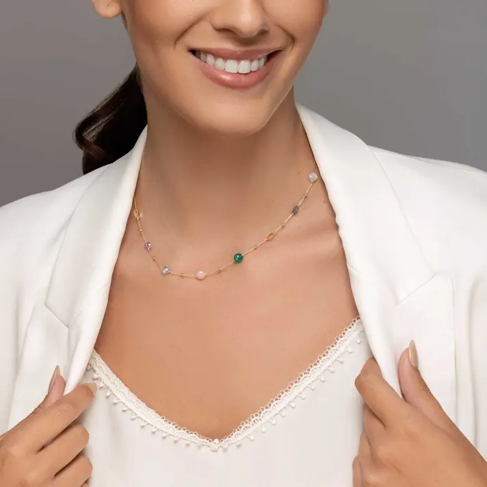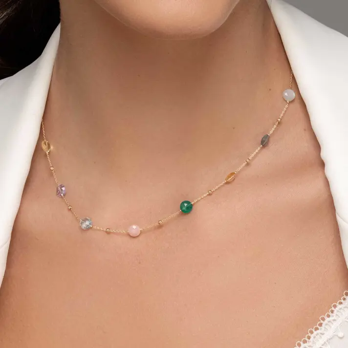 שרשרת רקפת, מקולקציית ENERGY GEM - עשויה זהב 14K צהוב, בשיבוץ אבני חן טבעיות. אבני החן ידועות כבר במשך שנים רבות כאבנים ייחודיות עם כוח מיסטי ועם תכונות מעצימות, כאשר לפי האמונה, כל מי שמחזיק באבן זוכה באנרגיה מיוחדת השייכת לאותה האבן. בשרשרת זו משובצות אבני החן לימון קוורץ, אמטיסט, בלו טופז, פינק אופל, סיטרין.