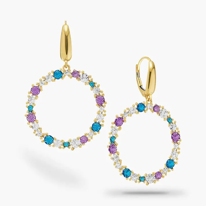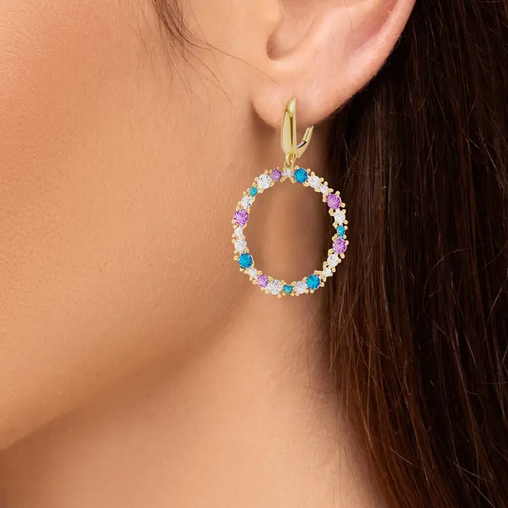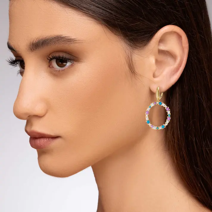 עגילי זהב 14K עם זהב מרוקע מחופה אמייל צבעוני. קוטר העגיל 2.8 ס"מ ואורכו 4.2 ס"מ.