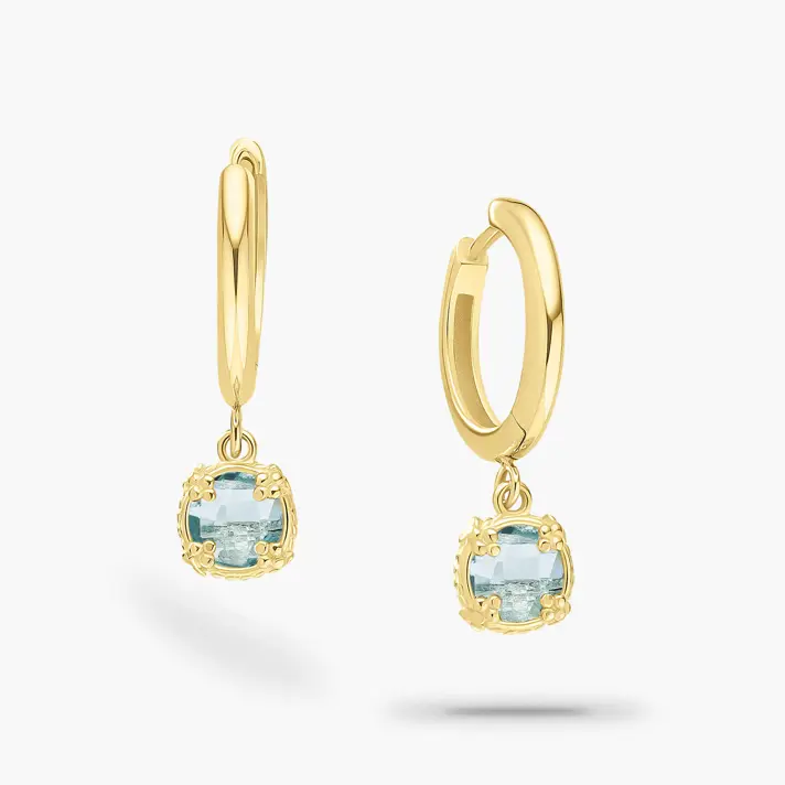 עגילי זהב 14K חישוק בקוטר 1.3 ס"מ ועליו תלויה אבן בלו טופז בצבע תכלת בקוטר 6 מ"מ. אורך העגיל 2 ס"מ.