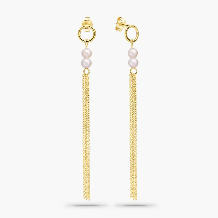 עגילי גאלה ארוכים, עשויים זהב 14K בשילוב פנינים. אורך העגילים 7 ס"מ.