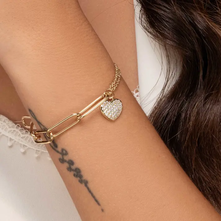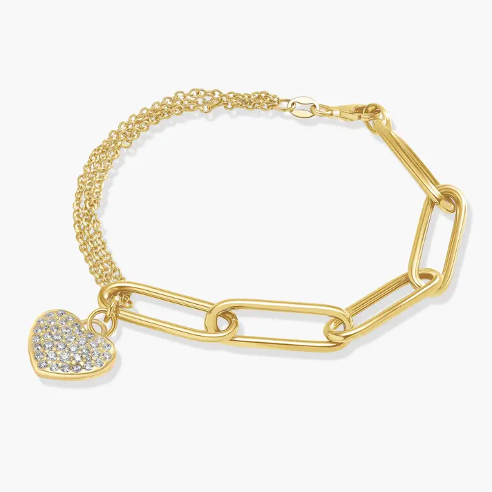 צמיד זהב המשלב חוליות ושרשרת משולשת עם תליון לב משובץ זירקונים