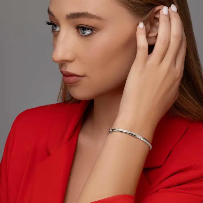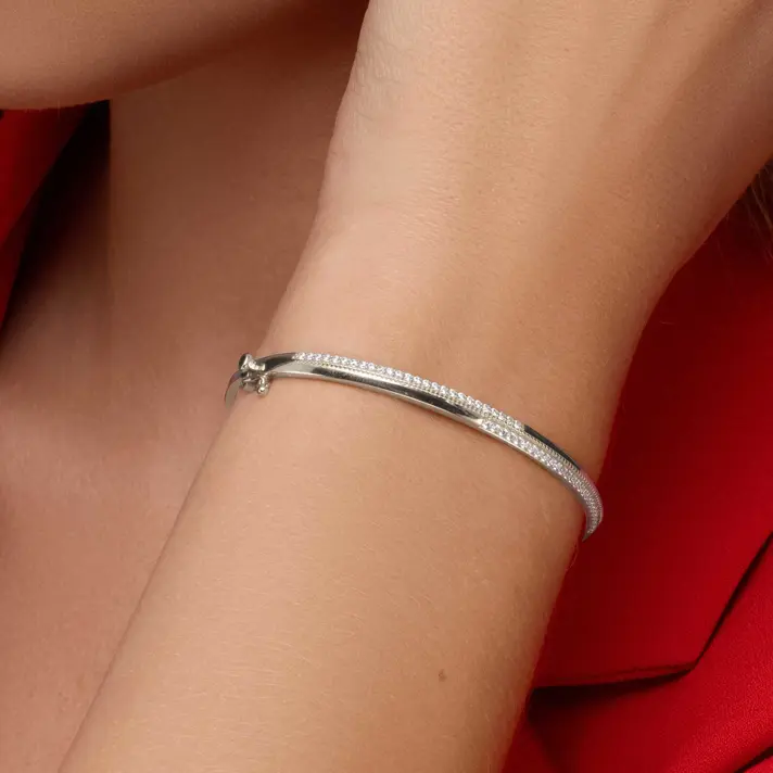 צמיד קשיח דנה- עשוי 14K זהב לבן, בשילוב שני פסי זרקונים נוצצים. מידות הצמיד 6*5.1 ס"מ