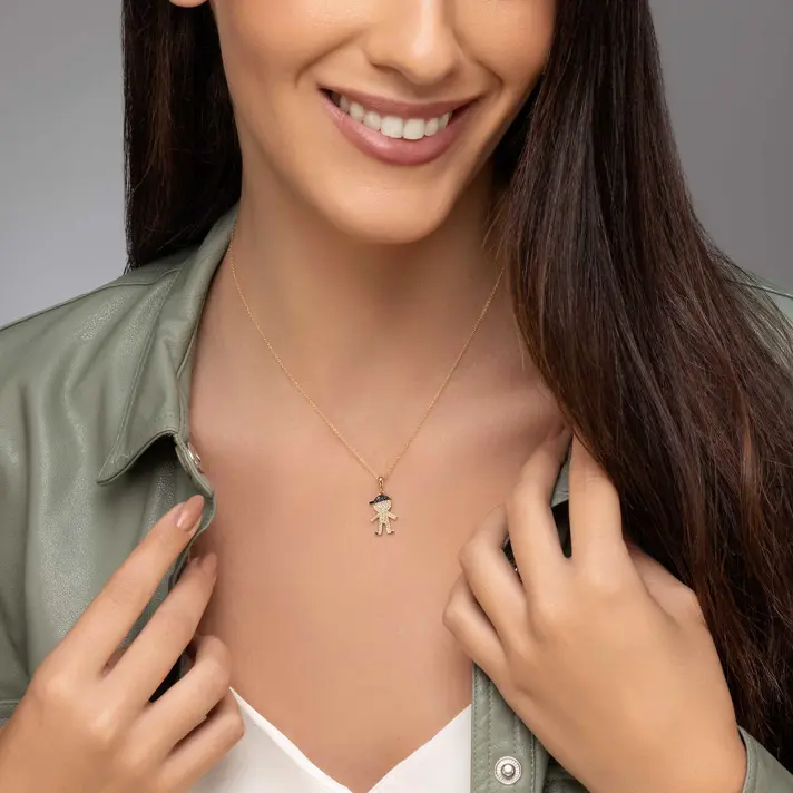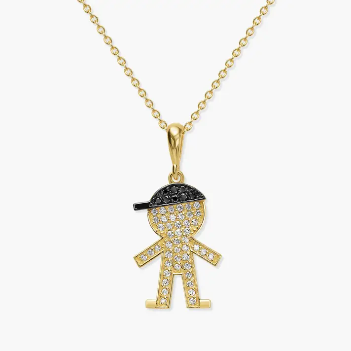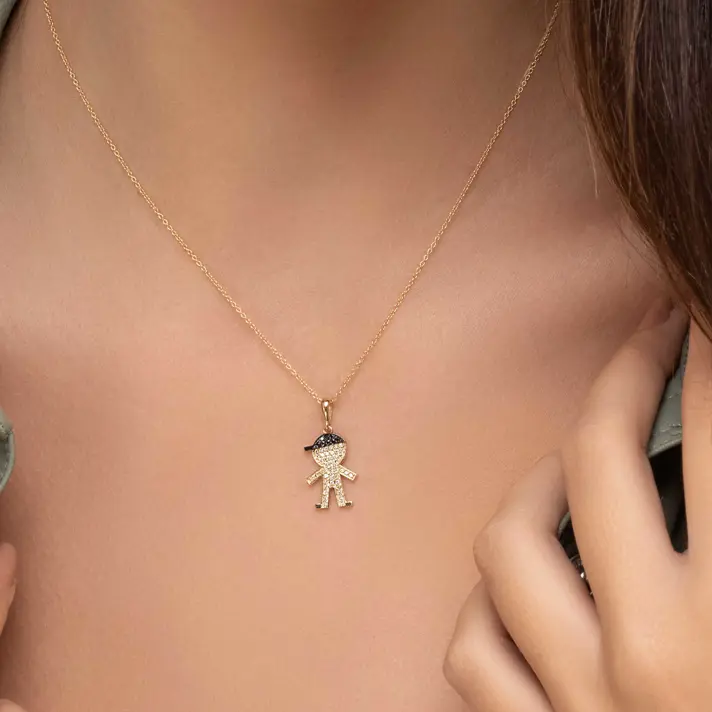 המתנה המושלמת שכל יולדת תשמח לקבל! תליון זהב 14K בצורת ילד בשיבוץ 45 יהלומים לבנים ו 8 יהלומים שחורים. כל היהלומים טבעיים ונוצצים. אורך התליון 2.3 ס"מ כולל הלולאה.