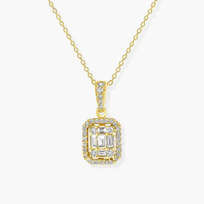 תליון זהב 14K מלבני משובץ ביהלומים טבעיים ונוצצים בחיתוך באגט ועגול. סה"כ משובצים בתליון 40 יהלומים. רוחב התליון 7.7 מ"מ ואורכו 9.4 מ"מ. אורך התליון כולל הלולאה 1.5 ס"מ