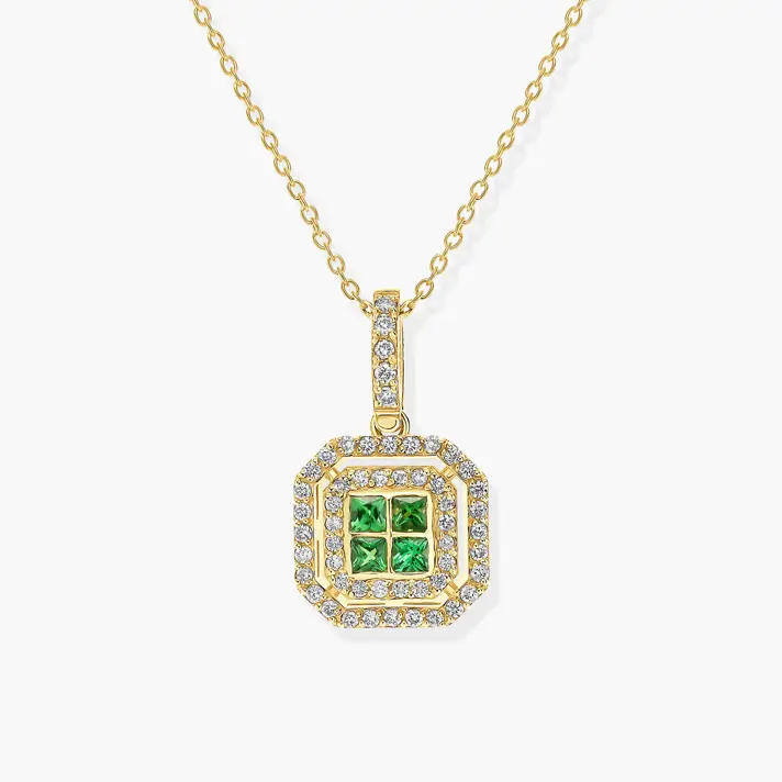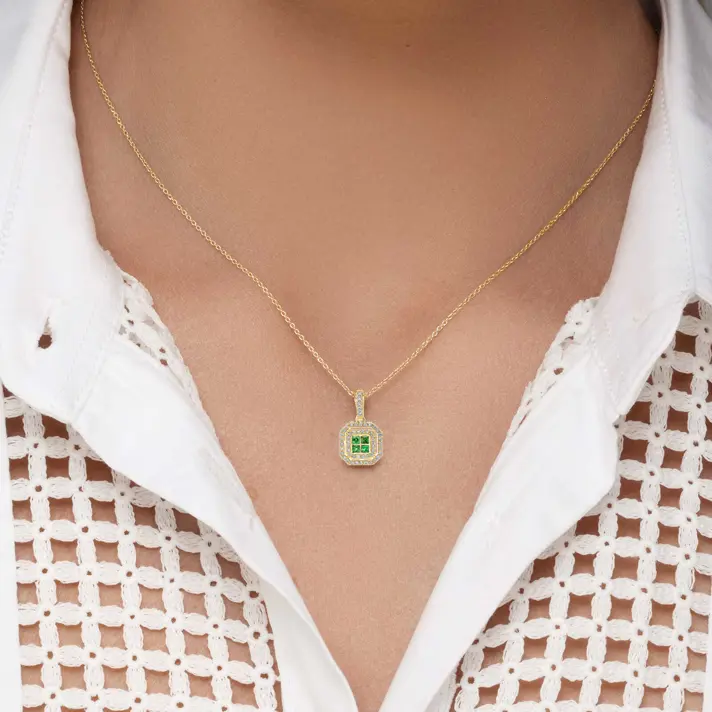 תליון זהב 14K מרובע מסדרת החושן משובץ באבני גרנט ירוקות מוקפות 53 יהלומים טבעיים ונוצצים. מידות התליון 1.1*1.1 ס"מ ללא הלולאה.