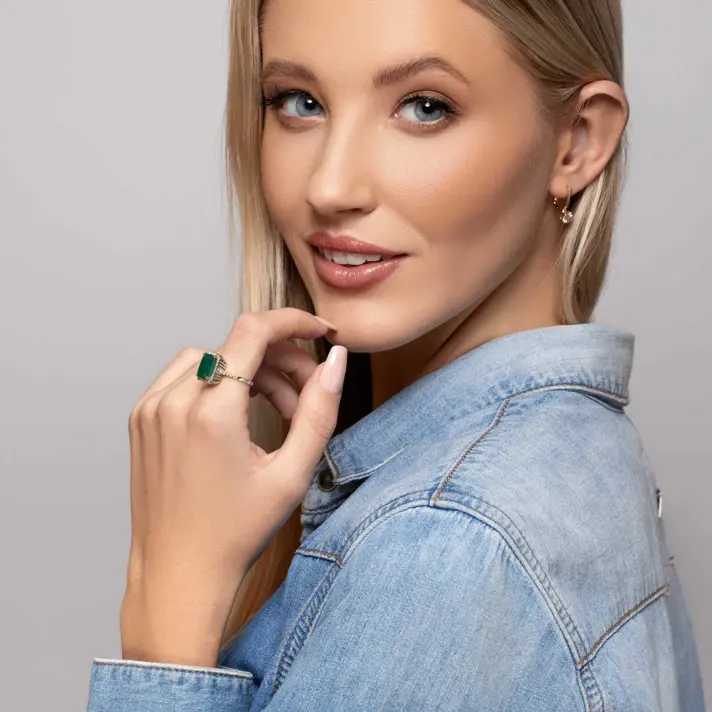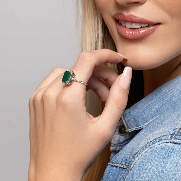 טבעת זהב 14K משובצת אבן אגת ירוקה מרובעת בגודל 8X10 מ"מ מוקפת 42 יהלומים טבעיים ונוצצים.