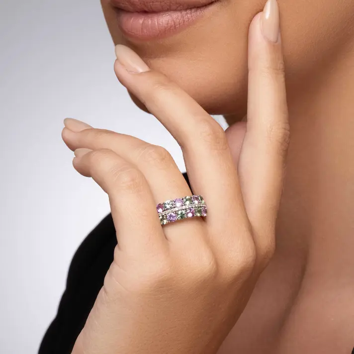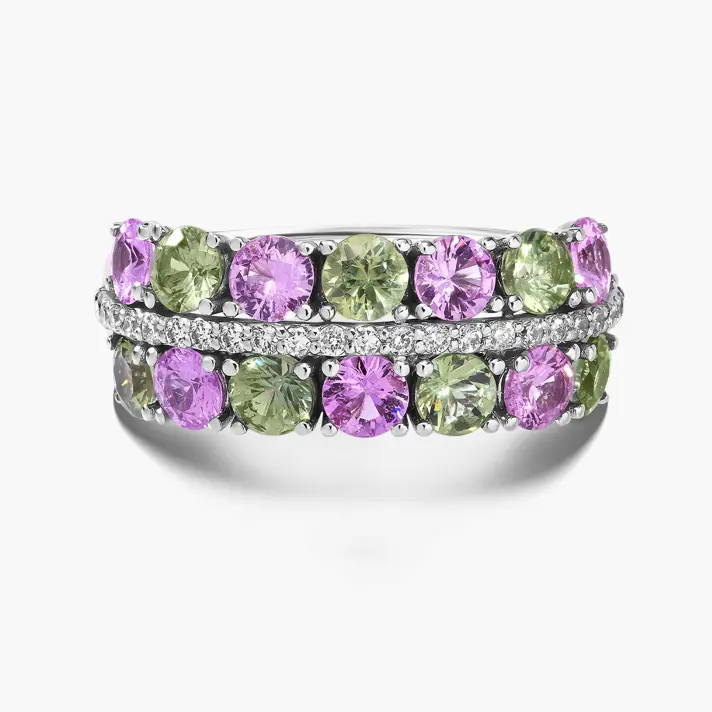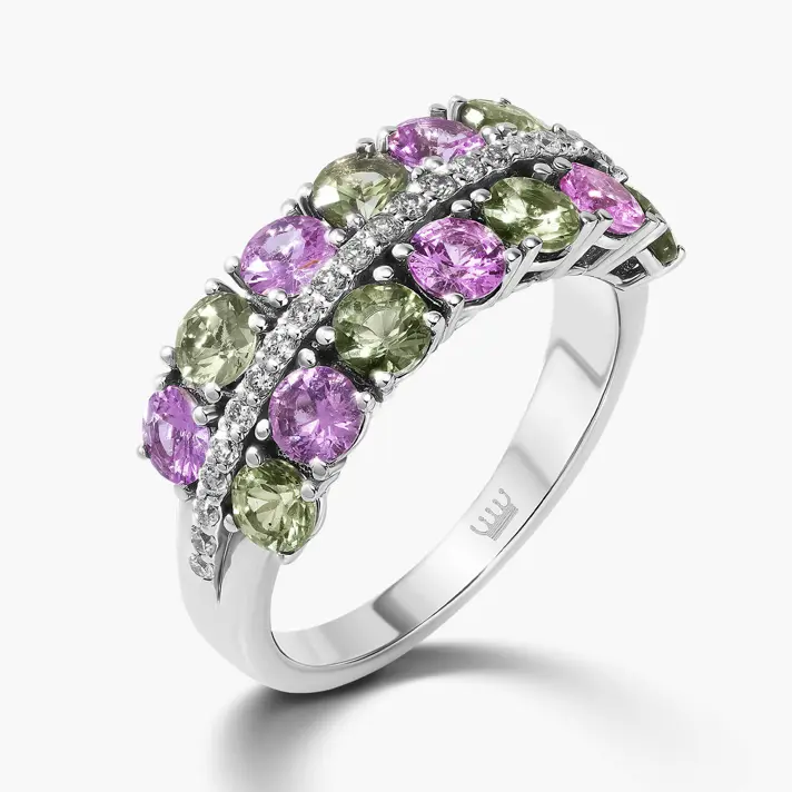 טבעת טווס עשויה זהב 14K לבן בשיבוץ 14 ספירים ירוקים- סגולים ו 25 יהלומים טבעיים ונוצצים.