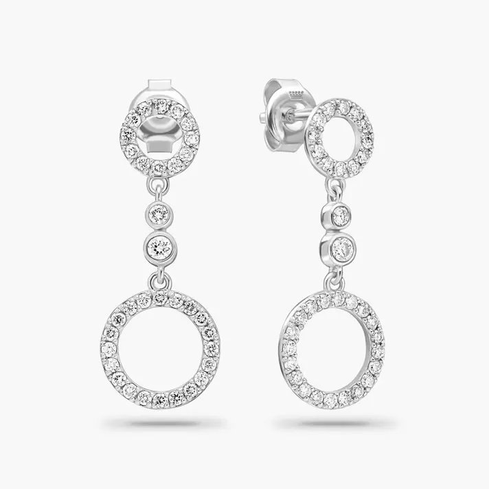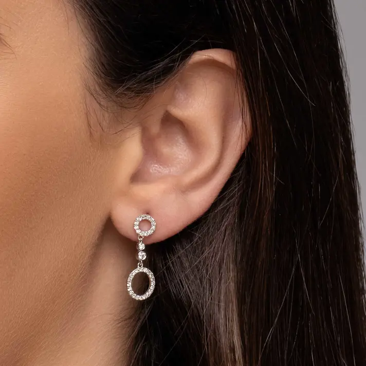 עגילי זהב 14K הבנויים משני חישוקים המחוברים בינהם ומשובצים 68 יהלומים טבעיים ונוצצים. אורך העגילים 2.6 ס"מ, קוטר החישוקים 0.6 ו 0.9 ס"מ