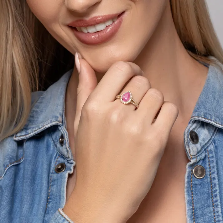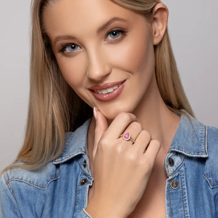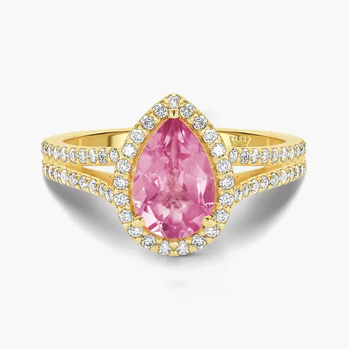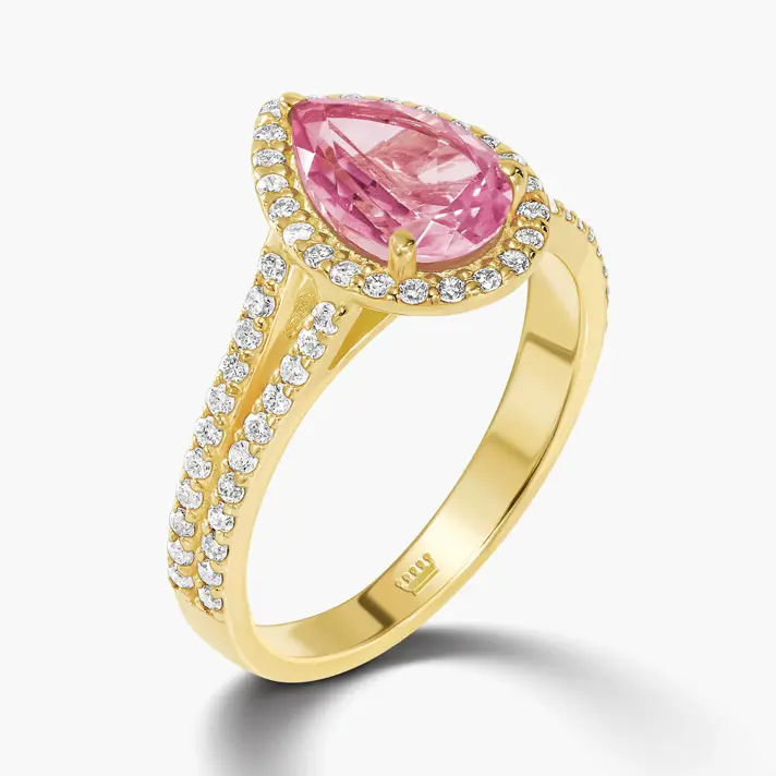 טבעת זהב 14K המשובצת באבן טופז ורודה בחיתוך טיפה יוקרתי מוקפת 67 יהלומים טבעיים ונוצצים.