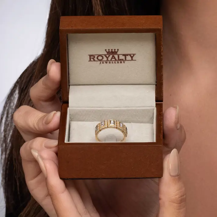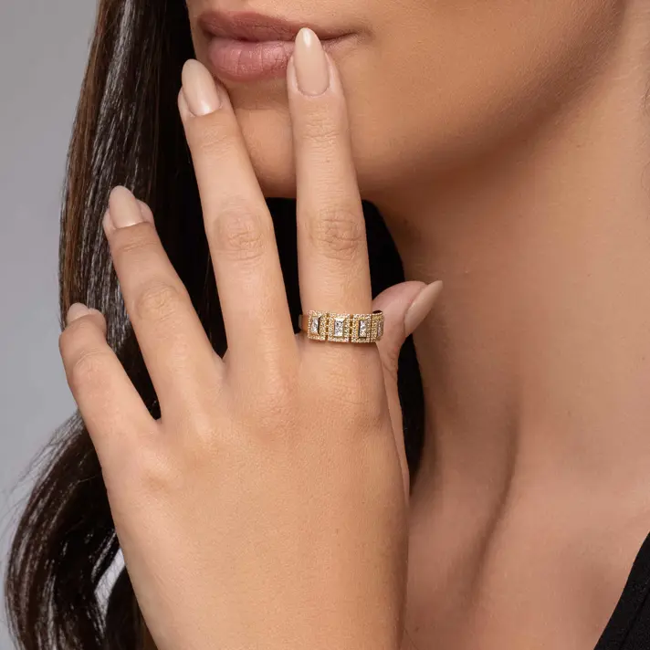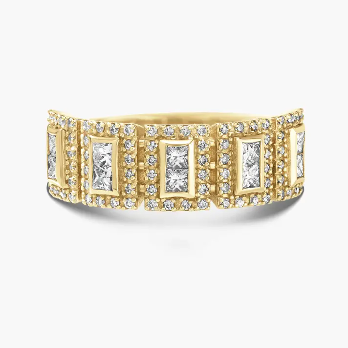 טבעת זהב 14K המעוצבת עם 10 יהלומים יוקרתיים בחיתוך פרינסס המשובצים בתוך 5 צורת מלבנים המוקפים יהלומים בחיתוך עגול. סה"כ משובצים בטבעת 90 יהלומים טבעיים ונוצצים. לפירוט נתוני היהלומים ניתן ללחוץ כפתור נתוני אבני החן. רוחב הטבעת 7 מ"מ.