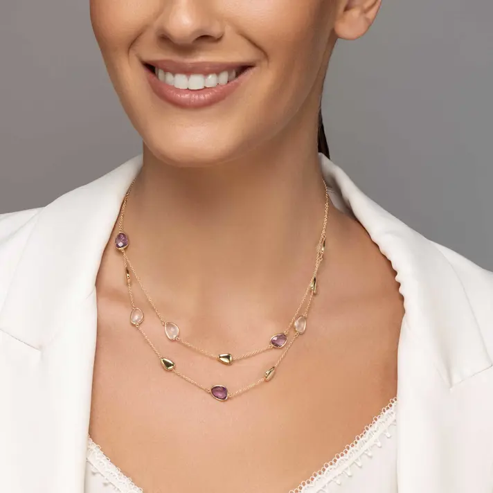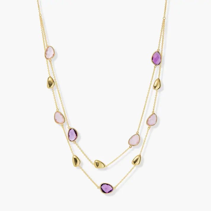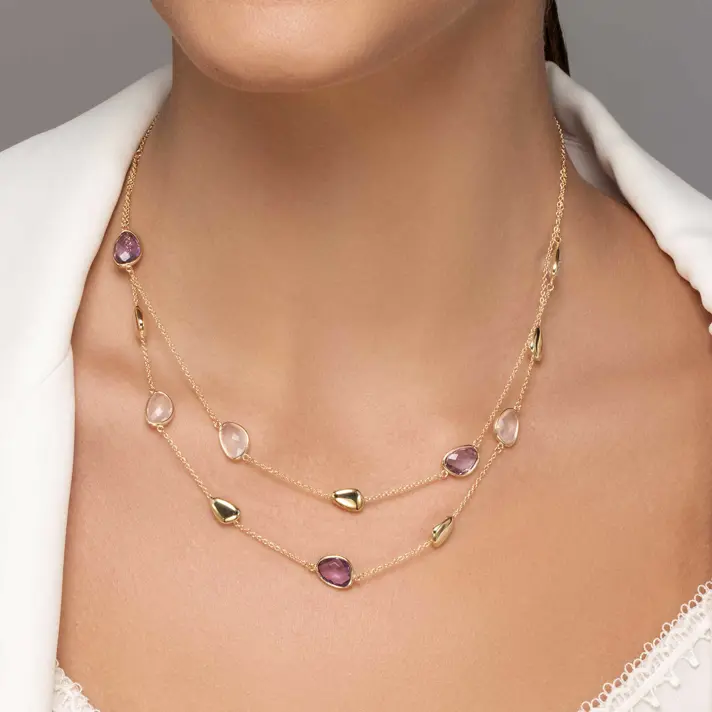 שרשרת זהב 14K כפולה מעוטרת במבני זהב בצורת חלוקי נחל ובאבני אמטיסט ורוז קוורץ. אורך השרשרת 43 ס"מ עם עוד 2 ס"מ הניתנים להארכה.