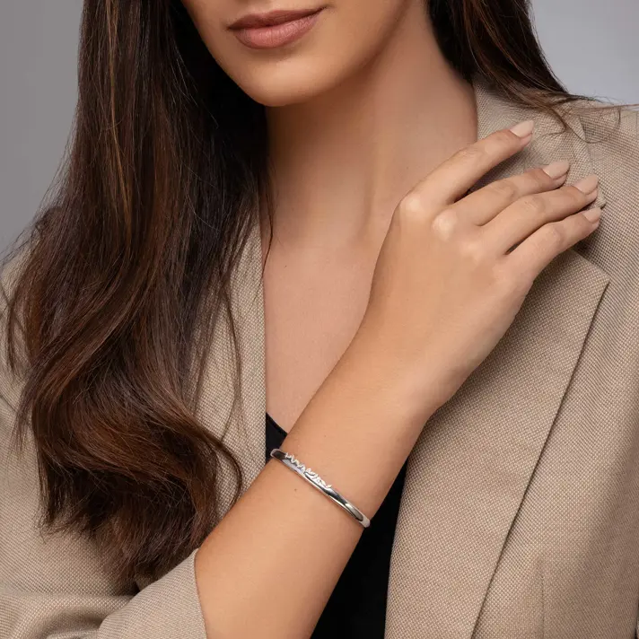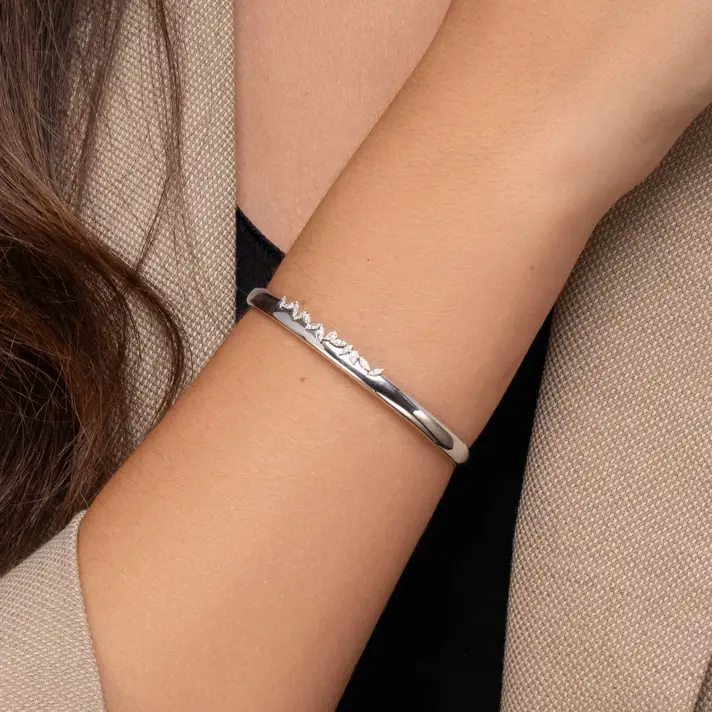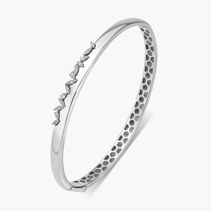 צמיד יהלומים קשיח, עשוי זהב לבן 14 ומשובץ 35 יהלומים טבעיים ונוצצים.