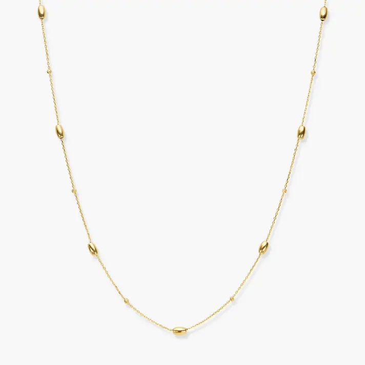 שרשרת צ'לסי עשויה זהב 14K צהוב בשילוב  חרוזי זהב בצורות שונות -7 בצורת אליפסה וגימור מבריק ו8 כדורי לייזר. אורך השרשרת 41 ס"מ.
